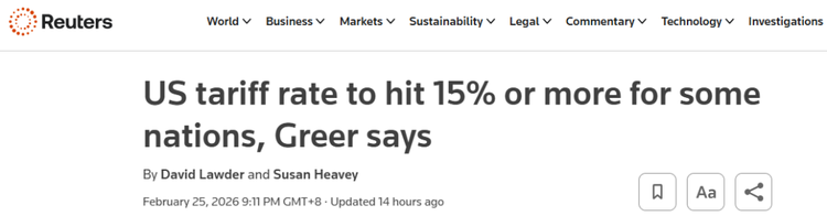 据路透社2月25日报道,当地时间周三,美国贸易代表贾米森格里尔表示,美国计划将部分国家的关税税率从刚实施的10%上调至15%及以上,但目前不对中国加征新关税。 当天在福克斯商业频道的节目上,格里尔称,特朗普计划于未来几周访华,因此政府无意提高对华商品关税至现有水平以上。 当被问及政府是否愿意对华商品加征高额新关税时,他回答说:我们不打算将关税提高到目前的水平以上。我们计划严格遵守与中方达成的协议。 格里尔还提到,特朗普政府正以新关税取代被最高法院否决的紧急关税,除了依据《1974年贸易法》第122条实施的临时关税10%外,根据该法第301条针对所谓不公平贸易行为启动新的贸易调查,将是此番关税替代安排的核心。 福克斯新闻网视频截图 不过,在当天接受美媒采访时,格里尔并未说明哪些国家税率将上调至15%。 他只是笼统表示,白宫正准备发布公告,将在适当情况下把临时关税上调至15%。目前我们实施10%的关税,部分国家将上调至15%,其他国家可能更高,我认为这与我们此前实施的关税类型相符。 格里尔还称,在最高法院败诉后,政府可能需要数月时间,以符合现有贸易协定的方式重建特朗普关税体系。他表示,美方计划利用这段时间依据其他授权开展贸易调查,为对特定国家和行业产品征收更具永久性的关税铺路。 另外,他表示,美方寻求与已达成贸易协定的国家保持政策连续性。在被问及上调关税是否违反美欧协定时,格里尔称稍后将说明如何兼顾其他国家,但未披露具体细节。