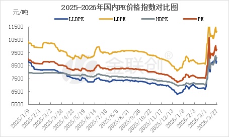 数据来源:金联创 2026年3月份,国内PE市场价格冲高回落后再次上涨,整体大幅拉升。2月28日美以对伊朗发动军事打击后,霍尔木兹海峡这一全球能源咽喉实质性关闭,成本支撑强劲加上中东货源预期减少,PE市场大幅度上涨,LDPE产品领涨。3月10日随着战争因素弱化、地缘风险溢价快速回吐,行情迅速暴跌,回吐部分涨幅。之后市场围绕着美伊战争、霍尔木兹海峡、中石化降负等消息面反复涨跌,剧烈波动。截止到3月27日,国内PE价格指数9759,较上月底涨2250,其中LLDPE指数8815,较上月底涨2148,LDPE价格指数11139,较上月底涨2519,HDPE价格指数9105,较上月底涨2087。 2026年4月份,市场将继续围绕着霍尔木兹海峡实际通行情况、原油价格、国内油制企业降负力度、下游复工订单的真实强度而波动。4月份国内装置检修增多,由于原油供应问题,多数油制生产企业降负10%-30%生产,中东货源减少导致进口到港量下降,同时内外价差拉大,出口窗口可能进一步打开,部分分流国内供应端压力,国内后续供应有进一步收紧预期,但前期高价位库存有待于进一步消化。需求面来看,4月下旬地膜需求旺季结束,由于国内原料价格大幅波动,市场心态预计以谨慎观望、按需采购为主,下游及中间商对高价抵触明显,多随用随拿,囤货意愿偏低。综合上述,4月份市场呈现供应有收紧预期,成本有托底,但需求跟涨或乏力的特征,预计市场在供应收缩、成本支撑偏强同时高价位需求跟进乏力的双重限制下,表现为区间大幅震荡,线性8500-10000元/吨,价格向上突破需要超预期驱动,如中东冲突升级油价重上新高、国内石化加大降负力度,向下大跌则需要原油意外暴跌或实际需求低于预期。建议密切关注霍尔木兹海峡实际通行情况、原油价格、国内油制企业降负力度、下游复工订单的真实强度。 中东冲突导致原油战争溢价不会短期消化,国内油制企业降负不会短期完成,同时国内出口窗口打开,市场价格重回战争前低价可能性不大。而经过3月份暴涨后,市场参与者情绪面更加理性,下游与中间商不再轻易追涨,加上下半年国内新增产能增加,价格水平突破3月高点重刷新高可能性不大。 国内政策面对行情有托底,4月进入两会政策密集落地期。2026年经济增长目标4.5%-5%,赤字率4%,新增政府债券11.89万亿元,政策取向更加积极有为。货币政策延续适度宽松,央行明确将综合运用降准降息等工具。对聚乙烯行业而言,最关键的政策信号来自反内卷首次写入政府工作报告,低端通用料无序扩张将受抑制。同时两新政策进入落地期,为家电、汽车、包装等核心下游提供需求支撑。整体看,4月国内宏观对聚乙烯构成底部支撑,但向上弹性仍需等待需求端实质性改善。