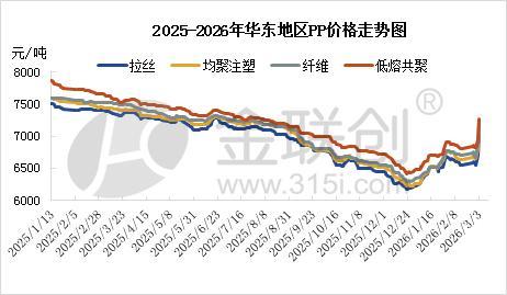 数据来源:金联创 美国和伊朗军事行动持续,带动原油及化工产品大涨。3月3日,PP2605合约价格延续涨停,开盘价7037,最高价7223,最低价7021,收盘价7223,结算价7130,较前一交易日涨408或5.99%。现货市场同步宽幅上涨,华东地区PP价格来看,拉丝收盘7050-7250元/吨,均聚注塑收盘7100-7350元/吨,低熔共聚收盘7130-7400元/吨,均较昨日涨320-400元/吨。 2月28日起,国际地缘政治局势骤然紧张,美国与伊朗发动军事打击,国际原油应声大涨。随后伊朗关闭霍尔木兹海峡,直接导致国际原油供应预期大幅收紧,国际原油持续上涨,纽约商品期货交易所WTI 4月原油即期合约收盘上涨4.21美元/桶,至71.23美元/桶,涨幅6.28%。洲际交易所布伦特5月原油即期合约收盘上涨4.87美元/桶,至77.74美元/桶,涨幅6.68%。在外部环境以及成本面的影响下,PP主力合约连续两个涨停,石化企业纷纷上调出厂,中石化及中油以及地方企业上调在300-500元/吨,部分企业多次上调。贸易商报盘上调,但贸易商对后市多看好,近两日,午后均出现封盘停售现象。原料价格的快速上涨和货源的紧张,下游企业不得不主动提价求货,甚至接受远高于心理预期的采购价格,以保障生产线的正常运转。 后市关注点,原料供应方面,从原料供应根基来看,霍尔木兹海峡的封锁对PP产业链形成直接影响。全球约30%的原油海运量、近20%的丙烷出口量需经由霍尔木兹海峡运输,而中东地区作为全球原油和丙烷的核心产区,其供应的稳定性直接决定PP成本端的安全边际。国内部分生产企业已经出现降低负荷生产现象。外部环境,此前,特朗普宣布要对伊朗持续四周军事行动,市场仍存在剧烈波动预期,聚丙烯市场仍存宽幅上涨预期。近日,聚丙烯基本面表现对市场影响较小,建议密切关注地缘动态和原油价格走势,同时做好库存管理和风险控制。