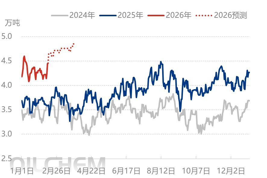 【导语】受春节假期影响,2月国内产量预计296万吨,3月或因新增产能释放达327万吨创单月新高。当前下游工厂开工率37.76%且持续下滑,节前需求走弱致市场交投清淡。2月供应压力缓解但需求复苏偏缓,节后价格或震荡下行,后续随着3-4月传统旺季临近及工厂全面复工,供需趋于平衡,市场有望止跌回稳。 1 、国内PE装置投产情况 表1国内PE装置投产明细(单位:万吨/年) 企业全称 装置类型 产能 投产时间 山东裕龙石化有限公司 2#LDPE/EVA 30 2026 年1月 山东新时代高分子材料有限公司 LLDPE 25 2026 年6月 山东新时代高分子材料有限公司 HDPE 45 2026 年6月 新疆东明塑胶有限公司 FDPE 40 2026 年6月 华锦阿美石油化工有限公司 HDPE 30 2026 年8月 华锦阿美石油化工有限公司 HDPE 20 2026 年8月 华锦阿美石油化工有限公司 FDPE 45 2026 年8月 山东裕龙石化有限公司 2#LDPE/EVA 20 2026 年下半年 中煤陕西榆林能源化工有限公司二期 HDPE 30 2026 年三季度 中煤陕西榆林能源化工有限公司二期 LDPE/EVA 25 2026 年三季度 浙江石油化工有限公司 3#LDPE/EVA 10 2026 年四季度 浙江石油化工有限公司 2#LDPE 40 2026 年四季度 中沙古雷乙烯项目 HDPE 40 2026 年四季度 中沙古雷乙烯项目 FDPE 60 2026 年四季度 蓝海新材料(通州湾)有限责任公司 FDPE 20 2026 年四季度 宁夏宝丰能源集团股份有限公司四期 FDPE 30 2026 年12月 内蒙古荣信化工有限公司 HDPE 40 2026 年底 数据来源: 隆众资讯 2026 年PE预计新增产能550万吨/年,其中LDPE新增产能为125万吨/年,HDPE新增产能为255万吨/年,LLDPE新增产能为170万吨/年。一季度预计有30万吨/年LDPE/EVA计划投产,该装置计划主产EVA产品,对聚乙烯供应影响不大。 2 、国内PE月产量预期持续增加 图1国内PE产量变化走势图(单位:万吨) 数据来源:隆众资讯 按照目前已知装置情况测算,2月份较其他月份天数减少,所以国内聚乙烯产量小幅减少,预计在296万吨左右,较1月份预计减少3.10%,受新增装置产能陆续释放影响,国内PE的产量持续增加,预计3月份将达到在327万吨左右,或将刷新国内聚乙烯单月产量新高 。 3 、国内PE下游开工率预期小幅下降 图2国内PE下游开工率走势图 数据来源:隆众资讯 目前国内PE下游工厂开工率在37.76%左右,整体呈下跌走势,仅食品、日化包装有节前刚性备货支撑,工业膜需求偏淡,北方棚膜需求收尾,南方订单零星,地膜逐步启动但备货尚早,开工提升有限。受春节假期影响,PE下游工厂整体开工率持续下滑,包装膜、农膜开工均大幅走低,节前交易冷清、企业集中放假。节后需求缓慢恢复,包装膜预计小幅回升,农膜短期仍处低位,全面复工多集中在3月初。 4 、国内 PE市场 预期维持下行 图3国内PE市场价格走势图(单位:元/吨) 数据来源:隆众资讯 当前已进入春节前最后一周,聚乙烯市场价格呈现周度下行态势,跌幅区间为14-261元/吨。受下游企业陆续停工放假影响,市场需求季节性走弱,交投氛围持续清淡,整体成交活跃度不足。展望2月,国内聚乙烯供应压力将进一步缓解,预计国内产量减少19.64万吨,进口量环比下降7.05%;但需求端复苏节奏偏缓,节后下游工厂完全复工需推迟至3月初,尽管节后企业存在补库需求,且宏观层面有望释放利好消息,但短期内供需矛盾仍难完全化解,预计节后聚乙烯市场价格将维持震荡下行趋势。随着下游工厂全面复工复产,叠加3-4月传统需求小旺季临近,市场需求逐步回暖,供需格局将趋于平衡,聚乙烯市场价格有望止跌回稳,行业景气度逐步修复。