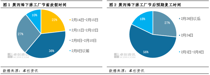 导语 临近春节假期,市场整体交投氛围清淡,节日效应逐步显现。据卓创资讯针对 PP 下游工厂春节假期前后的调研显示,行业整体运行节奏与往年基本一致:节前停工集中、复工时间分布相近,下游原料库存整体不高,成品库存去化顺畅,市场情绪以看跌为主。基于本次调研结果,卓创资讯预计,节后首周PP价格或将震荡偏弱运行,建议密切关注宏观波动、需求修复及中上游库存变化。 开工:下游节前集中停工、节后复工计划及假期时长符合往年常规 临近春节假期,PP主要下游工厂已陆续进入停工放假节奏,据卓创资讯对45家PP下游样本企业的最新调研显示,本周下游行业已步入节前集中停工期,尤其是近两日,停车企业数量出现显著攀升。行业整体开工率快速下滑。从停工时间分布来看,63%的企业集中在2月8日至2月12日停车(农历腊月二十一至腊月二十五),主要受终端订单收尾、物流停运等因素驱动;另有22%的企业选择在2月14日至2月15日(农历腊月廿七至腊月廿八)停车,这类企业多见于薄壁注塑、BOPP膜、无纺布、塑料托盘等对订单交付要求较高的细分领域。另外调研来看,受在手订单良好支撑,BOPP膜企业春节期间停机率较去年明年下降。 从节后复工计划来看,调研数据显示,近56%的企业计划于2月24日(农历正月初八)复工复产,这一比例与往年基本一致,体现了行业对节后需求恢复的常规预期;另有27%的企业计划将复工时间推迟至2月26日(农历正月初十)以后,部分企业因员工返乡返程周期较长而延后开工。整体来看,本次春节假期聚丙烯下游工厂的停车天数集中在10-15天,与往年假期时长基本持平。 原料库存及备货:下游工厂节前备货受限 节后采购心态分化 原料库存方面,1月份以来PP原料价格持续高位运行,下游工厂受高价压制整体建仓力度有限,采购始终以刚需接货为主;进入2月份后,即使部分下游企业存在节前补库意愿,但高价依旧对整体备货形成明显抑制,仅少部分企业结合节后生产用料需求,提前小批量、适量锁定了部分原料库存,以此保障复工后的生产连续性。叠加当前市场对节后原料走势持谨慎态度,加之企业年末资金回笼需求较为强烈,下游工厂整体节前原料备货规模有限。 据卓创资讯对45家PP下游工厂的调研数据显示,40%的企业原料库存在10-15天区间,且多数集中在10-12天,另有27%的企业原料库存在7天左右,整体处于偏紧的刚需库存水平。原料库存能够达到20天以上企业主要集中在BOPP膜厂、大型管材厂及少数改性工厂。BOPP膜厂前期通过锁价补充原料库存,叠加订单表现良好,对原料库存形成支撑;大型管材工厂的原料受石化企业排产周期较长、供货节奏固定的影响,企业需提前备货以避免复工后原料断供,因此库存水平偏高;少数改性工厂为石化合约客户,前期存在原料库存积压情况。 从春节后备货意愿来看,PP下游企业的采购心态呈现明显分化。据调研数据显示,有35%的企业表示,节前原料库存并未补至常规水平,节后复工后存在相对迫切的补货需求,以保障生产连续稳定运行;55%的企业则持谨慎态度,计划节后结合市场实际情况随行就市、灵活备货,一方面是考虑到节后企业复工节奏尚不稳定,员工返岗、生产负荷恢复均存在不确定性,另一方面也会密切跟踪原料市场行情变化进而指定采购策略;仅有10%的企业节前原料储备相对充足,库存能够支撑复工初期的生产需求,因此节后暂不着急拿货,采购节奏将保持平稳。 成本库存:下游工厂成品库存节前去化加快整体管控良好同比优化 从本次调研的样本企业成品库存来看,春节前PP下游各制品工厂的成品库存去化速度加快,整体库存结构趋于合理。据调研数据显示,节前下游工厂中成品库存处于常规水平的企业达到63%,占据主流;成品库存低于常规水平的企业占17%,库存高于常规水平的企业占比20%。与2025年相比,2026年下游制品工厂成品库存高于常规水平的企业占比明显减少,低于常规库存的企业数量占比则略有提升,显示下游企业整体成品库存控制良好。这一态势主要源于两方面因素:一方面临近年末,下游工厂为确保资金流动性及防止资金过度占用,主动加大出货力度、消化成品库存;另一方面,制品价格相对不高,终端企业也在一定程度上加大了采购力度,另外年底外贸订单尚可,亦有支撑。 从PP主要下游领域的库存表现来看,无纺布工厂、BOPP 膜厂、薄壁注塑工厂的成品库存整体维持中性水平,部分企业略低于常规库存;而管材工厂为筹备年后市场促销活动,提前备货生产,成品库存略高于常规水平;医疗类企业则受节前生产备货及订单储备影响,成品库存同样处于略高位置。节后需重点关注下游工厂订单情况,若订单改善节奏加快、下游成品库存去化顺畅,将对PP价格形成支撑。 心态及观点:PP下游工厂节后观点分歧多空震荡预期并存 从PP主要下游工厂对节后市场的观点调研来看,市场情绪呈现明显分化:52%的企业持看跌态度,核心观点认为春节后中上游企业惯性累库,去库诉求大,同时,PP同比供应压力大,叠加年后下游工厂从开机到订单-生产-销售链条顺畅运转仍需1-2周时间,且根据近两年的情况,开工提升节奏或偏慢,市场也存在惯性走弱的情况。约17%的企业持看涨观点,认为PP当前仍处于低估值区间,节前中上游企业节前预售充分,同时地缘局势仍有变动预期,叠加节后国内政策端的利好预期也将对市场形成一定支撑。另有约3