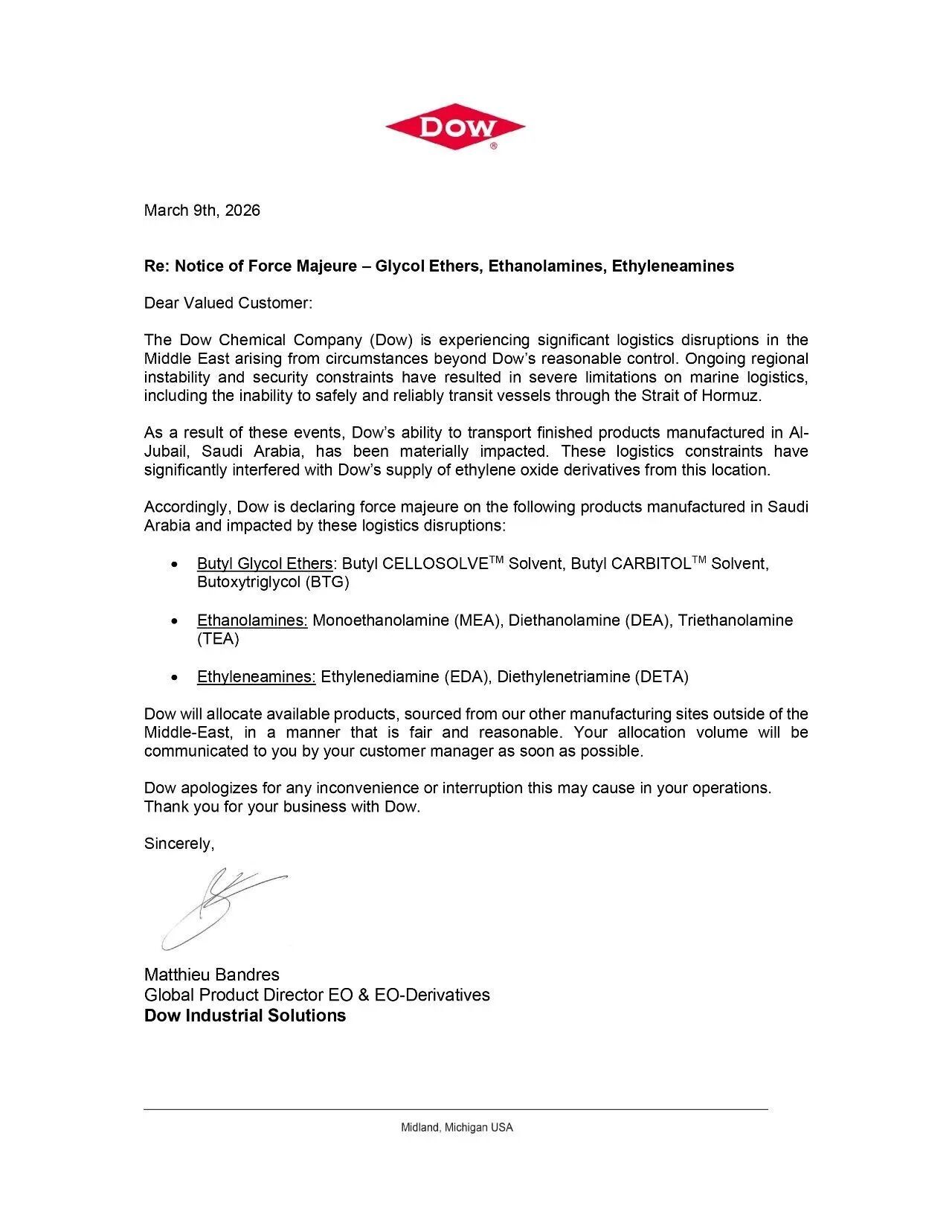2026年3月以来,中东地缘局势急剧恶化,素有全球能源咽喉之称的霍尔木兹海峡陷入实质性瘫痪,这一区域冲突引发的蝴蝶效应迅速席卷全球化工行业。短短一周内,万华化学、陶氏化学、英力士、隆华新材、台塑石化等国内外化工龙头企业密集发布不可抗力通知。从原料供应到产品交付,全球化工产业链正经历一场前所未有的冲击与重构。 化工巨头齐发不可抗力,断供预警席卷全球 随着霍尔木兹海峡航运通道的中断持续,依赖中东原料的全球化工企业被迫进入断供模式。从货物订单交付危机到生产装置降负运转,一场覆盖多行业的不可抗力潮已经形成。 3月7日,万华化学正式发布对中东地区所有产品不可抗力通知。通知明确指出,因霍尔木兹海峡航运路线的严重中断,货物交付面临不可预见、不可避免且无法克服的安全风险与履约障碍。值得注意的是,万华化学明确界定了不可抗力的适用范围,仅针对中东区域的订单与交付义务,其烟台基地两套乙烯裂解装置始终保持高负荷稳定运行,整体生产经营秩序未受影响,企业已第一时间启动应急响应机制,持续跟踪中东地缘态势,不可抗力的持续时间将根据局势变化动态调整。 紧随其后,隆华新材于3月10日发布对中东国家所有产品不可抗力的通知,宣布自当日起受中东局势影响的相关订单适用不可抗力条款,成为国内又一家受波及的化工企业。隆华新材聚焦聚醚多元醇(PPG)、聚合物多元醇(POP)及尼龙66生产,聚醚类总产能达百万吨级。 同日,天津乐金渤海化学正式宣告发生不可抗力事件,其表示霍尔木兹海峡的封锁已导致主要生产原料石脑油及乙烯供应面临中断,目前已处于无法调配乙烯的情况,直接影响生产履约,后期将逐步降低各生产设施的运营产能。 此外,3月9日,台塑石化股份有限公司也发布官方通知,因霍尔木兹海峡航运中断,公司从中东采购的原油、石脑油原料到港严重延迟,已对乙烯、丙烯两类核心基础石化原料发布不可抗力声明。此外,受原料到港延迟影响,自2026年3月9日起,FPCC烯烃事业部所有生产设施将被迫以最低产能运转。 欧美化工巨头同样未能幸免。3月9日,陶氏化学发函称中东地区的物流运营正遭受重大干扰,其位于沙特阿拉伯朱拜勒工厂的成品生产能力受到实质性影响,明确将丁基乙二醇醚、乙醇胺、乙二胺类等沙特制造产品列为不可抗力范围。 欧洲化工巨头英力士集团宣布,部分PVC合同供应受不可抗力影响,目前欧洲和土耳其的PVC价格飙升。同时,INEOS Oxide位于赫尔工厂的ETAC(乙酸乙酯)供应出现故障。 日韩石化巨头被迫降负生产。3月6日,LG化学宣布其羰基醇工厂运营严重中断,自当日起,部分3月至4月的对苯二甲酸二辛酯(DOTP)出口合同因不可抗力而暂停履行。DOTP是一种高性能增塑剂,尤其适用于对绝缘性能要求较高的聚氯乙烯电缆料、PVC软质制品和人造革膜等领域。此外LG化学已宣布将裂解装置负荷降至60%,并有可能关闭丽水园区的2号裂解装置。 韩华因原材料供应中断宣布碳二亚胺(EDC)供应遭受不可抗力,此次中断是由于其主要乙烯供应商于3月4日宣布发生不可抗力事件所致。同时,韩国最大乙烯生产企业YNCC因3月份石脑油原料交付受阻,宣布遭遇不可抗力,自3月4日起被迫以最低产能运营所有生产设施。 日本方面,3月7日消息,日本出光兴产株式会社已通知其商业伙伴,如果霍尔木兹海峡的封锁持续并阻碍从中东进口原材料,公司可能会停止在日本的乙烯生产。三井化学表示,正在研究其石脑油供应能够维持多久。同时,也在考虑从中东以外的地区(包括日本国内)采购更多石脑油。东丽塑料则宣布暂时暂停接受新订单,并更新自4月26日起的交货安排,直至原料供应情况趋于明朗。 霍尔木兹海峡瘫痪, 化工行业面临三重危机 这场席卷全球的化工不可抗力潮,根源在于霍尔木兹海峡这一全球能源与化工运输咽喉的封锁。根据金联创披露的数据,霍尔木兹海峡是波斯湾通往印度洋的唯一通道,2025年该海峡原油日均出口量约为1500万桶,约占全球原油海运贸易量的34%;2026年1月至2月27日,局势稳定期间,日均出口量更是达到1530万桶,而2月28日伊朗宣布封锁海峡后,日均出口量骤降至205万桶,截至3月9日,日均出口量仅为29万桶,航运几乎陷入瘫痪。 除原油外,该海峡还是中东石化原料(石脑油、乙烯等)出口的核心通道,亚洲超60%的石脑油进口、45%的LPG进口依赖该海峡。据ICIS数据显示,2025年,中东占全球大宗商品化学品和塑料出口的25%。一旦通道中断,全球化工供应链便会直接断血,击穿了全球化工业原料、能源、物流三重基础支撑,形成连锁传导效应。 图源:ICIS 连锁反应首先体现在物流链断裂。目前,位于霍尔木兹海峡周边海域的油轮航行速度已普遍降至零,包括全球运力第一的航运企业地中海航运公司(MSC)等多家航运巨头宣布暂停通过霍尔木兹海峡。此外,多家航运巨头宣布涨价,比如赫伯罗特以战争风险的理由增收附加费,每20呎货柜加收1500美元;另一航运巨企法国达飞海运(CMA CGM)对该区域订舱每个20呎货柜加收2000美元的附加费。停航叠加船公司增收附加费,这些举措将直接推高运费价格。受此影响,企业无法安全履约,万华化学等出口型企业只能依法启动不可抗力以规避违约风险。 其次是原料链断裂。中东石脑油、甲醇、天然气断供,导致亚洲多国化工企业减产停产,TDI、乙烯、纯苯等核心原料供给收