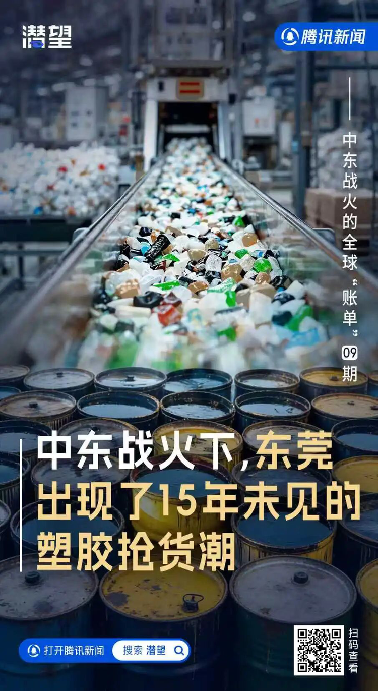 编者按:2026年初,发生在中东的战火,正越过传统的地理边界,以前所未有的烈度重塑全球资本版图、重构全球资本的风险定价逻辑。从霍尔木兹海峡的油轮停摆,到华尔街暗处涌动的流动性黑洞,战火的蝴蝶效应正在各个资产类别中引发剧震。 宏观周期与地缘政治迎头相撞,正在考验每一个市场参与者的韧性。面对这场复杂的系统性冲击,腾讯财经推出《中东战火的全球账单》系列内容,从供应链阻断与资本市场波动的复盘,到石油定价中枢偏移、避险资金对贵金属的重新配置、美联储在通胀与衰退间的政策掣肘,以及迪拜作为区域资金避风港的资产重估,我们希望通过持续的深度观察,梳理出宏观经济脉络与资产演变逻辑。 腾讯新闻《潜望》 文|顾翎羽 编辑|刘鹏 尽管特朗普暗示战争已接近尾声的表态让油价从高位有所回落,但伊朗和以色列的表态,让霍尔木兹海峡这一全球石油咽喉继续保持在封锁状态。持久战的预期下,中东战火的蝴蝶效应正在蔓延,并沿着产业链迅速传导至中国制造的腹地。 近一周来,中国最大的塑胶散货现货交易市场,东莞市樟木头镇百果洞路上连续出现了交通拥堵:一辆辆十几米长的重型货车首尾相连,排出了上百米的长龙。有货车司机早上抵达的车辆,直到深夜仍未排到卸货的号牌。 一位行业人士称,他从业15年来从未见过这样的抢货场面。 这一切的源头是中东战火。塑料作为典型的中间品,其上游是石油,下游流向电子、汽车、家电等各类工厂。而近期美伊冲突导致油价疯涨,让整条产业链都开始承压。 3月9日,WTI原油最高触及119.48美元/桶,布伦特原油最高119.5美元/桶,较冲突前涨幅约78%。在化工市场上,综合金投网等国内交易价格显示,聚丙烯(PP)主力合约 PP2605 涨停,报收8034 元/吨,单日大涨454元/吨;聚乙烯(PE)主力合约塑料2605收报7944元/吨,上涨449元/吨。 那么,这种抢货是真的需求提高,还是恐慌性囤货?会持续多久?对供应链又会有什么影响? 3月9日,当腾讯新闻《潜望》向当地了解抢购原因时,一位东莞当地资深企业人士表示,樟木头的塑胶抢购潮,短期虽然很大程度上是贸易商在买涨心理驱使下的投机性囤货行为,但如果中东冲突短时间内不能缓解,塑胶价格将会震荡上涨。 也就是说,虽然基本面可控,但当情绪驱动的泡沫遇上产能过剩的现实,一场供应链的风险正在暗流涌动。 大炮一响,黄金万两 樟木头镇的拥堵,和其行业地位高度相关。 这个面积118平方公里、聚集了近8000户塑胶市场主体的小镇,是全国最大的塑胶散货现货交易市场,年货物吞吐量超过750万吨,年交易规模超千亿元。 换句话说,樟木头镇是中国塑胶交易的晴雨表,但是,抢货发生得这么猝不及防,任谁也没有想到。 一位东莞当地企业协会人士表示,当地塑胶行业自己也懵了,堵车开始时从上到下都在排查原因。 2月28日,美国与以色列对伊朗发动联合军事打击。战火直接威胁到全球能源运输的咽喉霍尔木兹海峡。该海峡承担着全球约20%石油供应、27%海运原油贸易量,其中超过80%运往亚洲市场。更关键的是,亚洲超60%的海运石脑油进口依赖中东。 国际油价应声暴涨。截至3月9日,纽约原油期货价格盘中一度突破115美元/桶,较冲突前的2月27日的67.02美元暴涨达78%。 原油是石化产业链的最上游,接下来,整条产业链都开始了波动。价格飙升沿着原油石脑油烯烃塑料原料的链条迅速向下游传导。 亚洲石化市场高度依赖中东的石脑油供应,海峡受阻导致亚洲裂解装置原料供应陷入危机。韩国石化巨头YNCC、印尼石化生产商钱德拉阿斯里相继宣布遭遇不可抗力,多套装置面临降负或关停风险。 在成本抬升和供应收缩的双重预期下,国内化工品期货市场率先反应。3月2日至4日,甲醇、纯苯、丙烯、乙二醇、聚丙烯(PP)、塑料等期货主力合约批量涨停。 现货市场紧随其后。常用塑料袋原料LDPE在短短几天内暴涨18.92%,每吨涨价1633元;ABS、PC等部分原材料涨幅超过40%。 全球化工巨头也密集发布涨价函。万华化学、巴斯夫、中石油、中石化旗下企业纷纷宣布提价。 在这样的背景下,对樟木头镇的贸易商家来说,赚钱的机会,来了。 定价权后的隐忧 要厘清樟木头镇在这场全球供应链风暴中本身所拥有的吞吐能力和价格影响力,首先要厘清一个前提樟木头不只是传统的集散地,而是一个产业集群。 当地汇聚了全球60多个国家900余家石化厂、全国3000多家新材料生产企业,覆盖300多个品种、近10万个型号的塑胶材料供应链体系。当地企业生产的低烟无卤阻燃聚丙烯等关键材料,已占据全球70%以上的市场份额。 本质上说,这种现货交易活跃度和集群效应,让其在应对突发短缺和急需调货时,拥有了话语权。 近一周来,在樟木头镇交易市场上,出现了经销商捂盘拉涨、一小时一个价格的极端现象。本地市场报价已经整体突破了近五年价格高点。 贸易商则担心后续更贵,开启抢货、囤货模式。下游制造企业,包括电子、家电、包装厂,出于对原材料成本失控的恐惧,也纷纷赶来抢货。 这种基于买涨不买跌和恐慌性备货的从众心理,导致短时间内海量订单涌入樟木头。叠加春节后原本就是补库节点,以及3月初东莞正是雨天影响,巨量的货车集中涌向樟木头塑胶市场,最终导致了主干道上的大塞车。 2024-2025年,中国化工行业正处于产能扩张的高峰期,面临着严重的产能过剩压力。在需求端,虽然新能源、