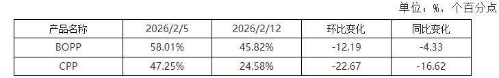 春节前聚丙烯期货2605日线收盘价格跌破5、10和20日均线,仅在40和60日均线之上,市场报盘整体低走,华东市场拉丝主流价在6550-6650元/吨。量仓方面,较期初成交量和持仓量双双减少,容量比率VR呈震荡下行的走势。12日收盘价格6648元/吨,较周初跌21元/吨或0.31%,区间振幅123或1.84%。 聚丙烯下游(分行业)开工周度对比表 数据来源:金联创 PP基本面偏弱态势未有实质性改变,下游总体开工率全线下降。下游BOPP开工率在45.82%左右,较上周开工下降,周内BOPP市场弱势整理,成本支撑不足,受春节放假多数膜厂停工影响,行业整体开工大幅下行。CPP行业开工率在24.58%左右,春节假期企业集中停工,下游食品日化等终端行业陆续放假,膜厂节前备货已基本完成,市场需求整体疲弱,仅少数大型企业维持低负荷生产,本期开工较上期大幅下滑。 数据来源:金联创 两油石化库存环比上周略增,目前低于去年春节前。下游厂家陆续停工放假,节前备货基本结束,市场交投趋淡,叠加石化、中石油合约户集中开单,库存向流通环节转移。截至2月12日,两油库存44万吨,环比增2万吨,同比去年节前减2.5万吨。 春节期间多数石化企业维持正常负荷生产,节后首周无大规模检修计划,但春节期间需求停滞,部分产能较大企业库容压力较大,石化企业急于移库,节后首周PP粒社会库存预计攀升。 需求端,节后下游企业呈梯度复工态势,节前备货充足,节后首周以消化库存为主,新单承接有限。元宵节前需求难以全面恢复,大规模采购预计在2月底至3月初启动。综上,预计PP粒料市场将呈现窄幅弱势整理态势。